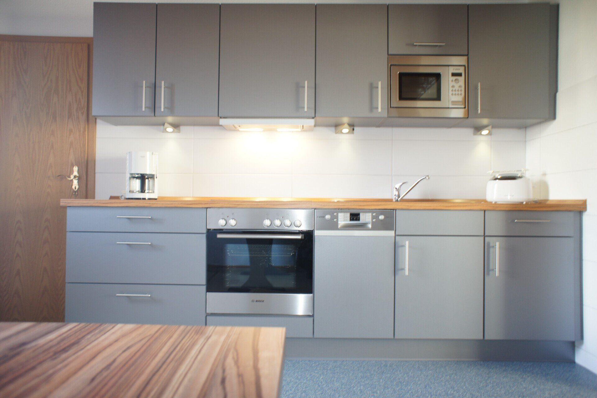 Die Einbauküche ist komplett ausgestattet und verfügt über einen Herd mit Ceranfeld, einen Backofen, einen Kühlschrank mit 3-Sterne-Gefrierfach, eine Mikrowelle, eine Spülmaschine, einen Toaster, einen Wasserkocher und eine Kaffeemaschine.
